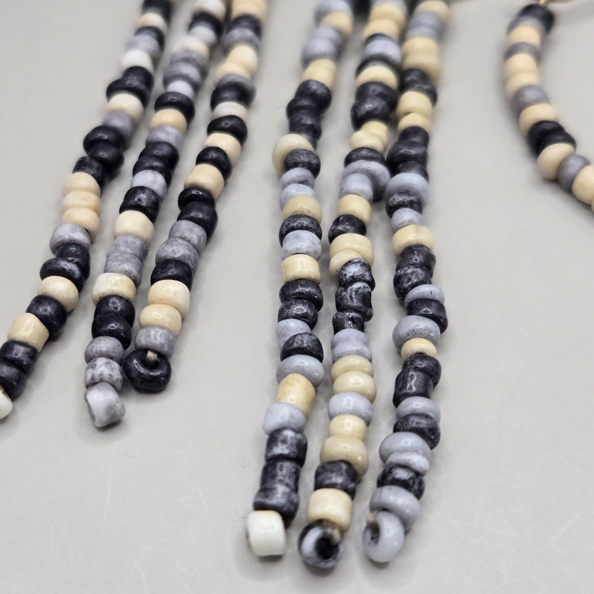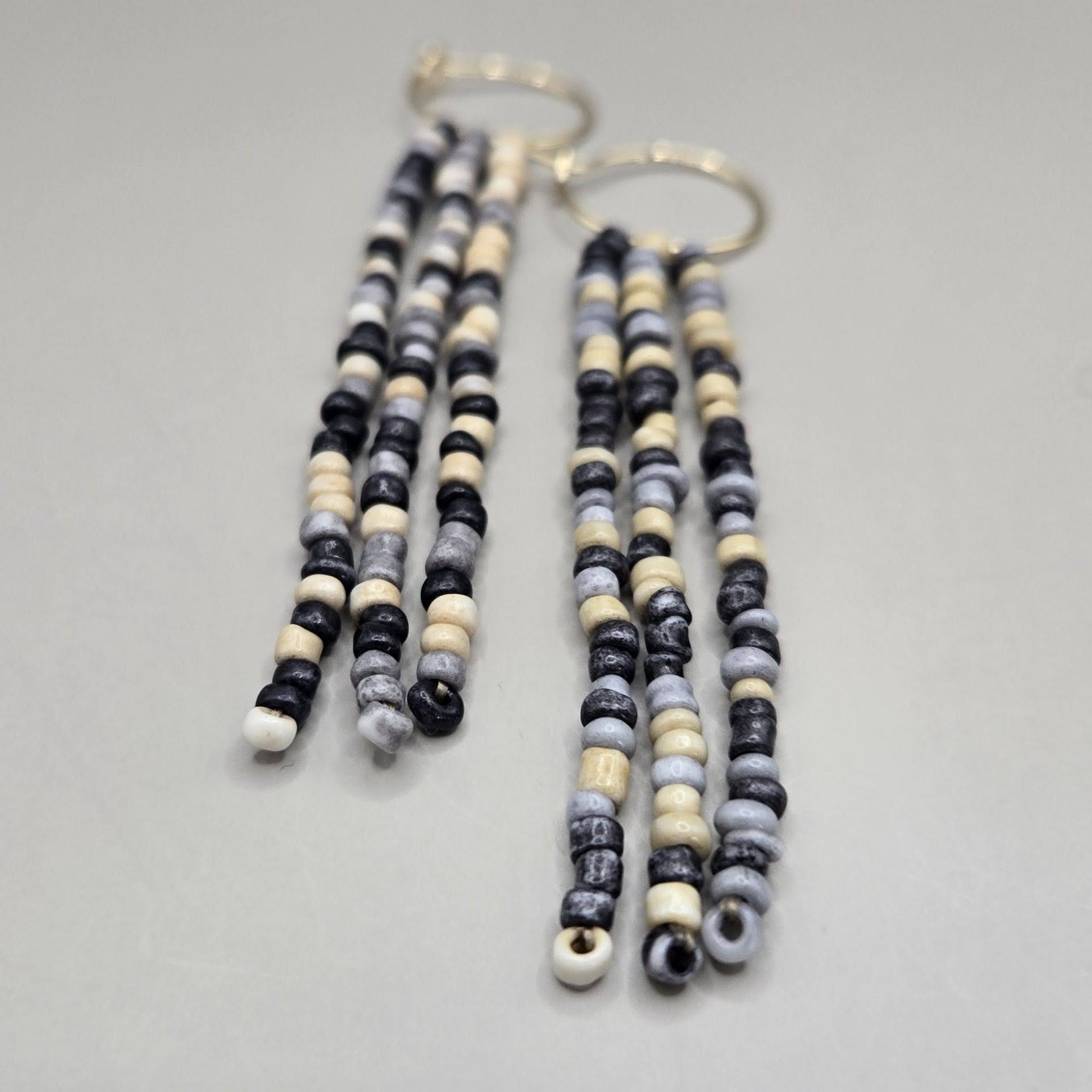 Frozen dark bead mix features two steely blue shades and tan/beige all with variable shapes and sheen for an energetic combination. These small dangles are lightweight with great movement.